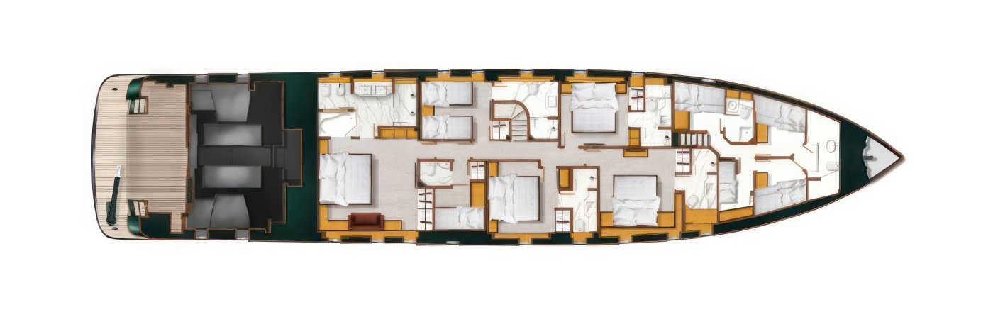 Exterior decks feature the aft deck with its shaded al fresco dining area, the fore deck’s large sun pads and the upper deck with an outstanding dining area for 22 guests. Her 7 star service inspires and elevates guest experience to the maximum, starting from daily changing of apparel and upgraded housekeeping to delivering top tier services in all aspects with great attention to detail.