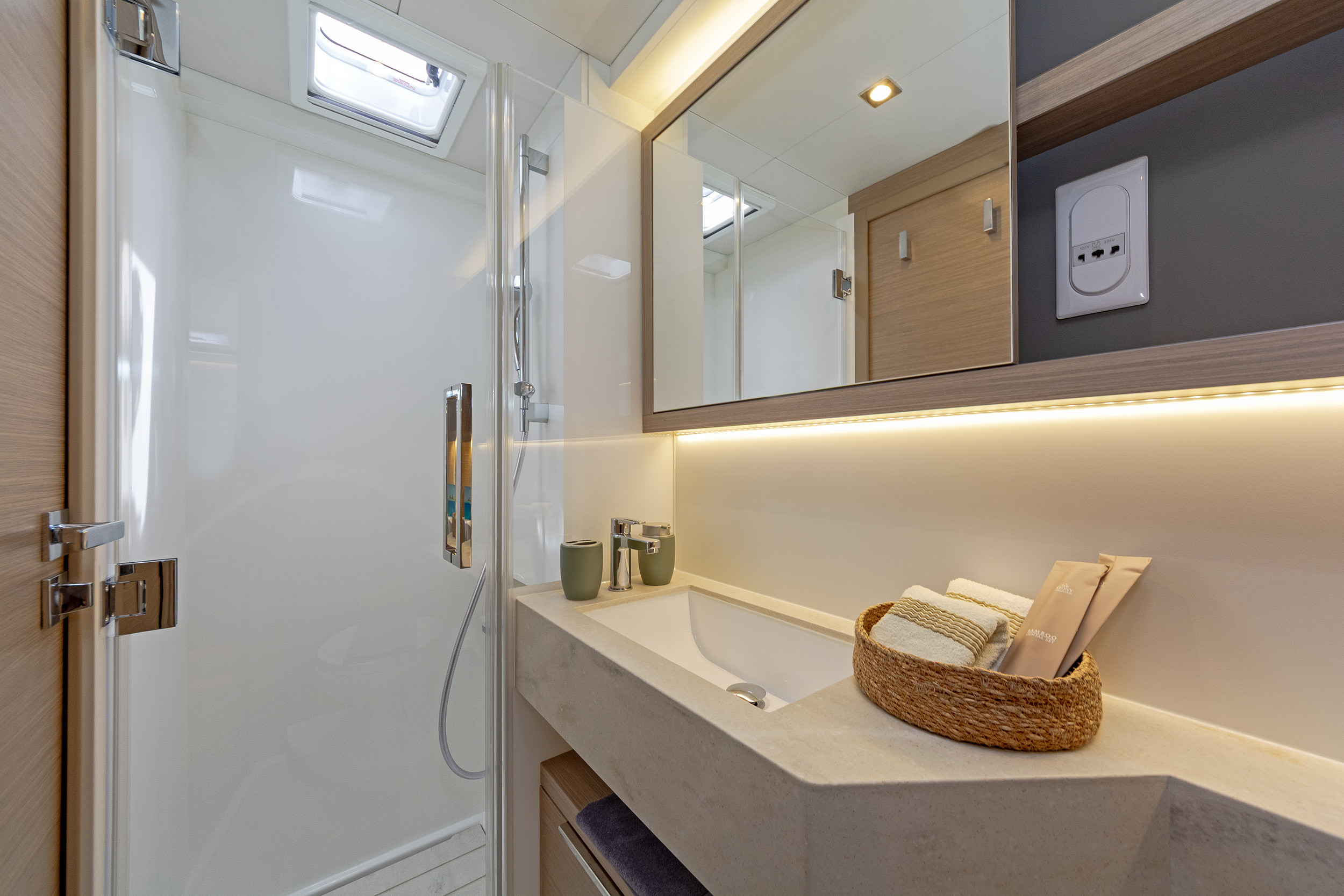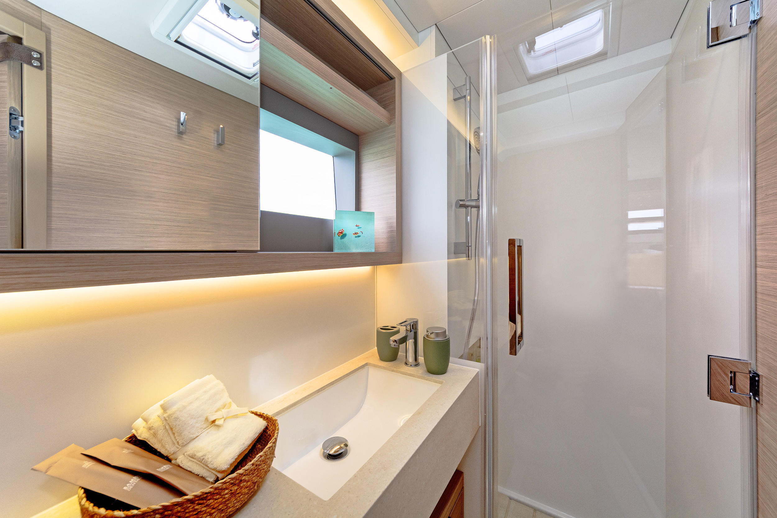 The yacht offers 4 double cabins, each with en-suite facilities, and 1 French double cabin that shares a bathroom.