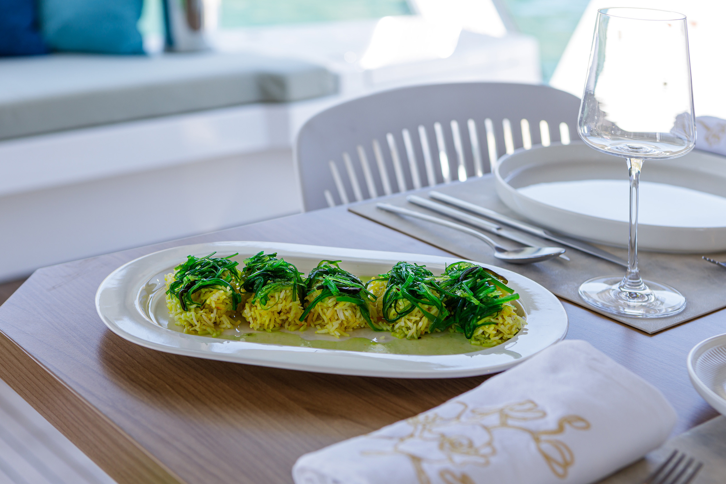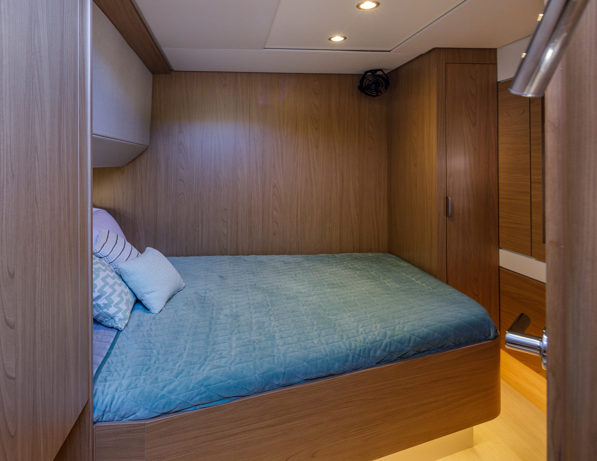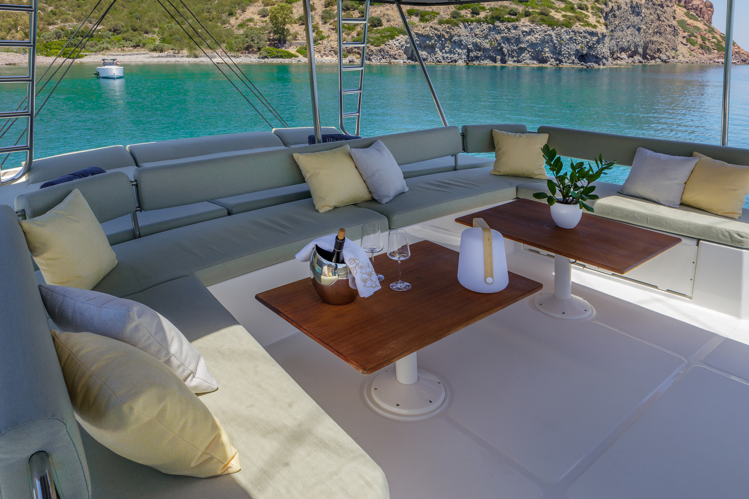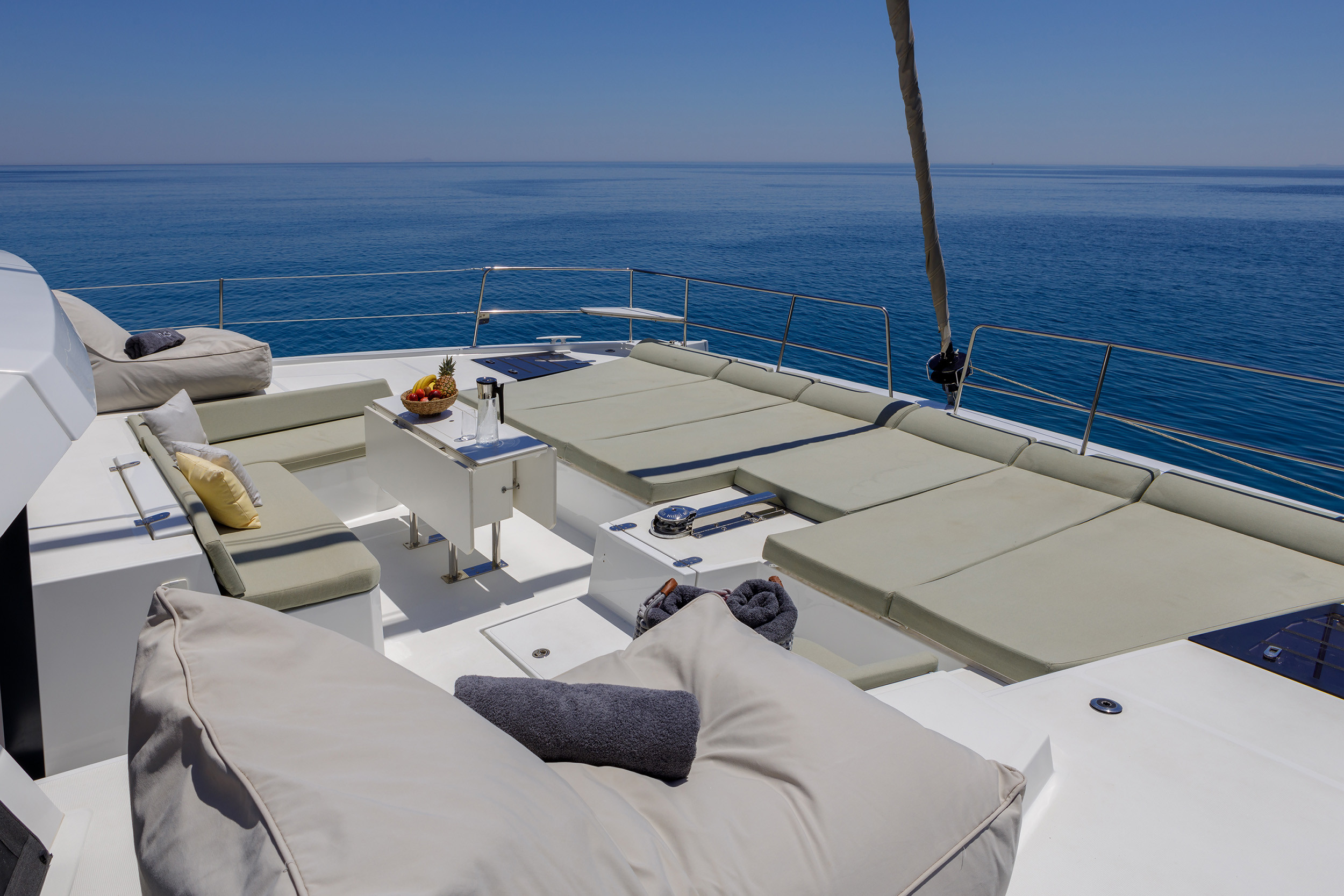 One of her most unique features is the forward deck saloon, a rare and luxurious layout element that allows guests to move effortlessly between interior and exterior spaces. This elevated lounging area is directly accessible from the main saloon, offering a private and open setting to enjoy panoramic views, sea breezes, or a sunset cocktail.