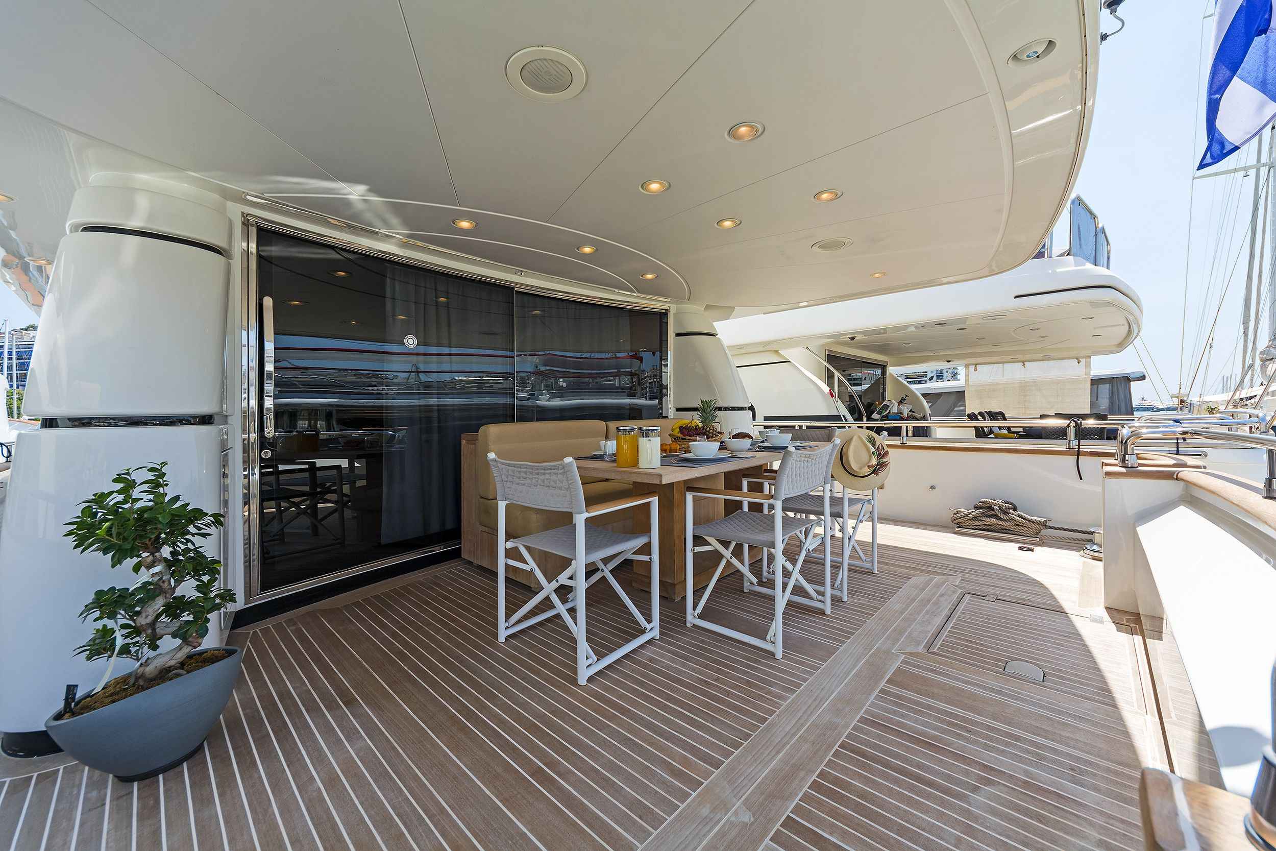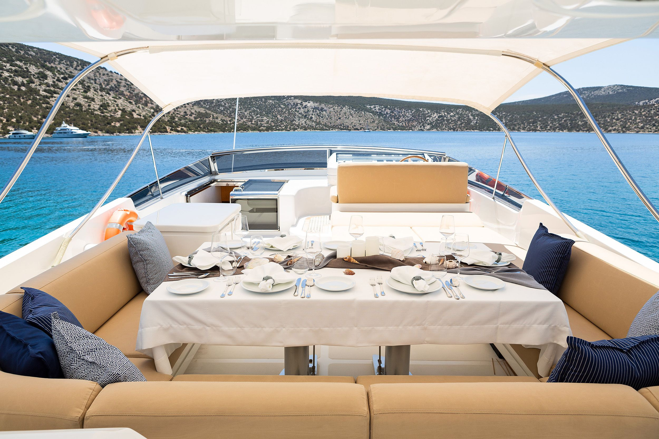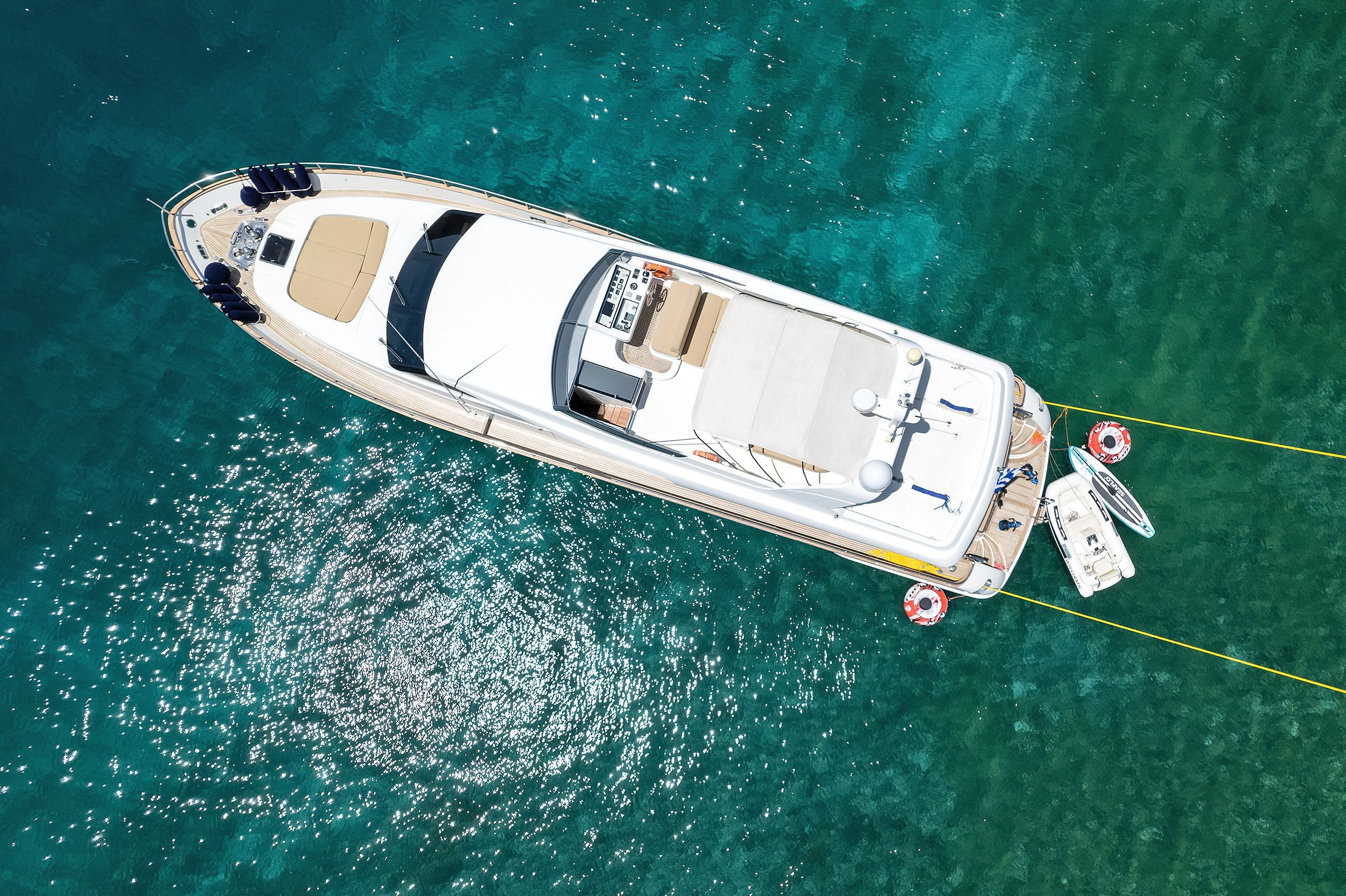 She provides a bright and airy interior for eight guests in four cabins consisting of a Master Suite, VIP Suite and two Twins, all with en suite bathroom facilities. In addition, the al fresco dining facilities accommodates eight guests in aft deck and leads upstairs to a spacious flybridge with barbeque facilities, making this place a favorite one for clients seeking impeccable views along with tasteful dining experiences.