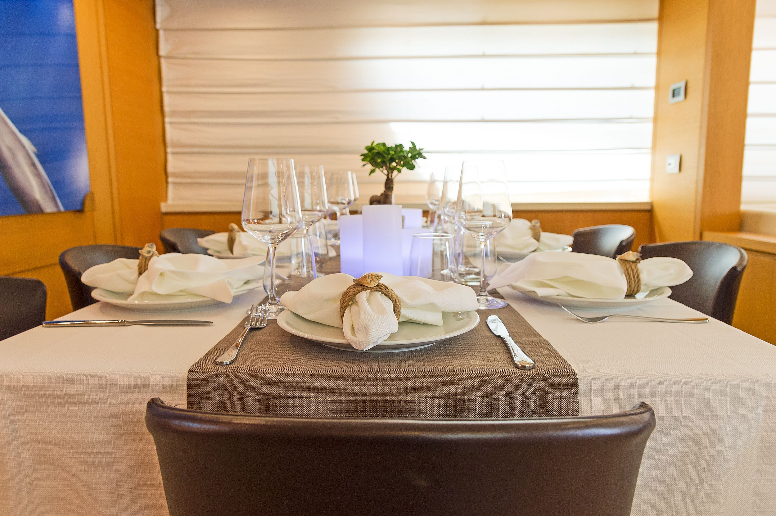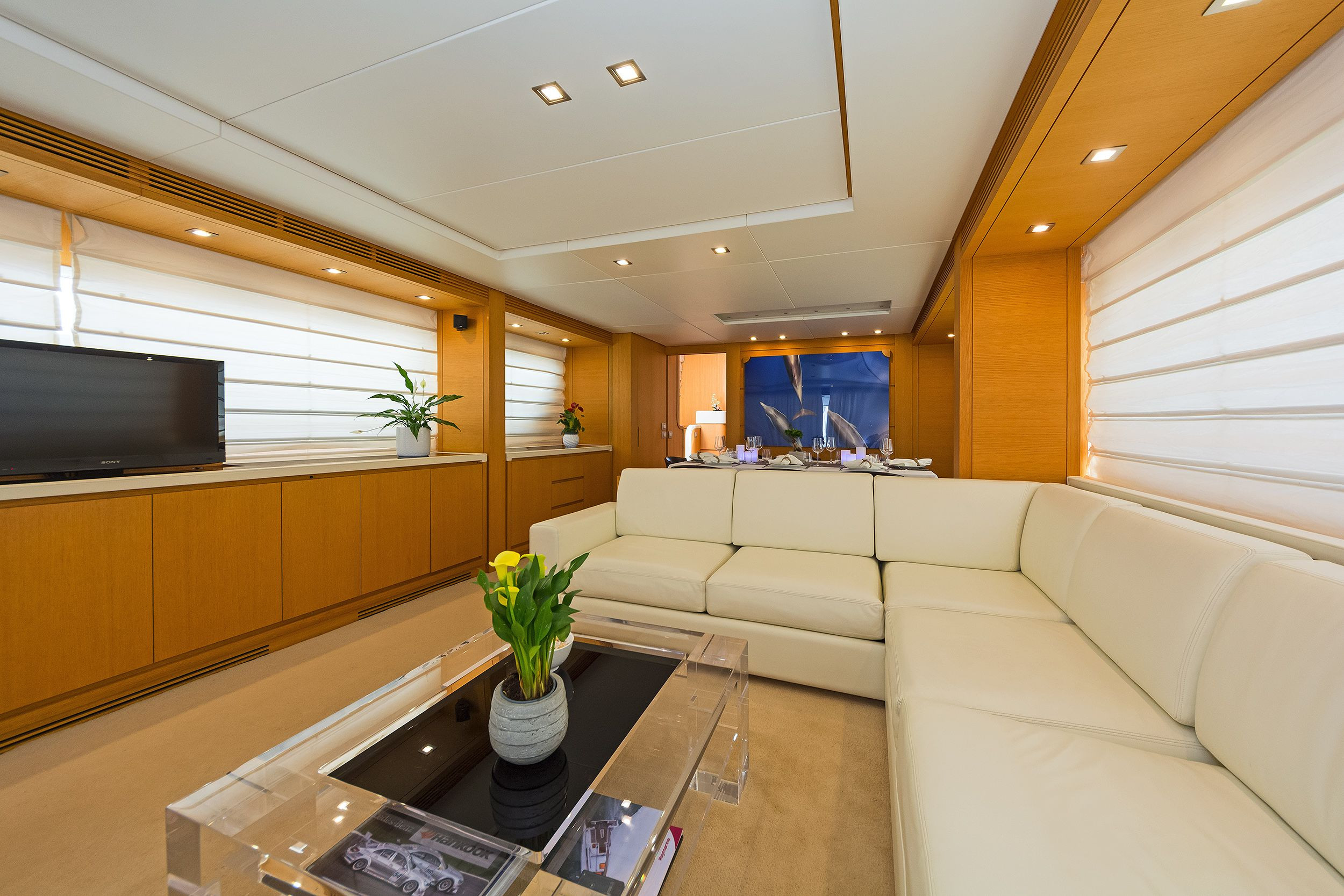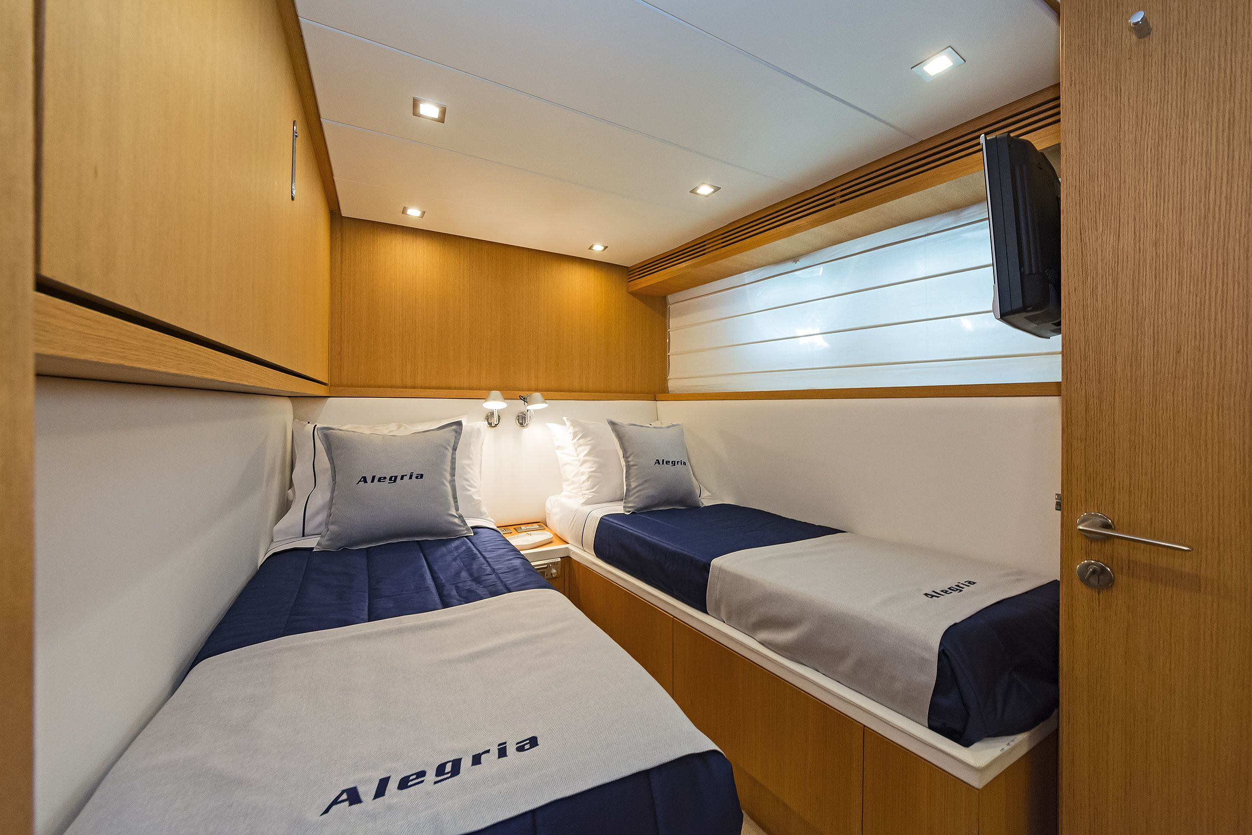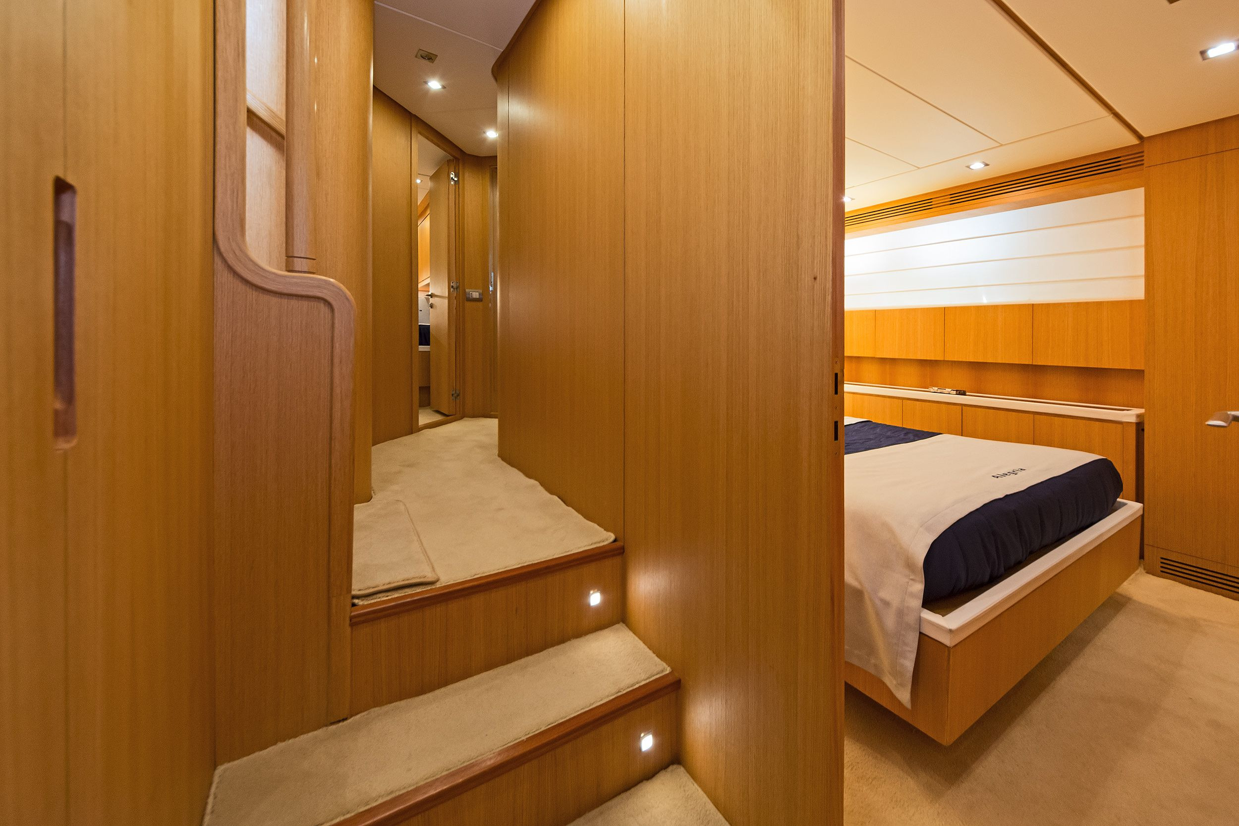 She provides a bright and airy interior for eight guests in four cabins consisting of a Master Suite, VIP Suite and two Twins, all with en suite bathroom facilities. In addition, the al fresco dining facilities accommodates eight guests in aft deck and leads upstairs to a spacious flybridge with barbeque facilities, making this place a favorite one for clients seeking impeccable views along with tasteful dining experiences.