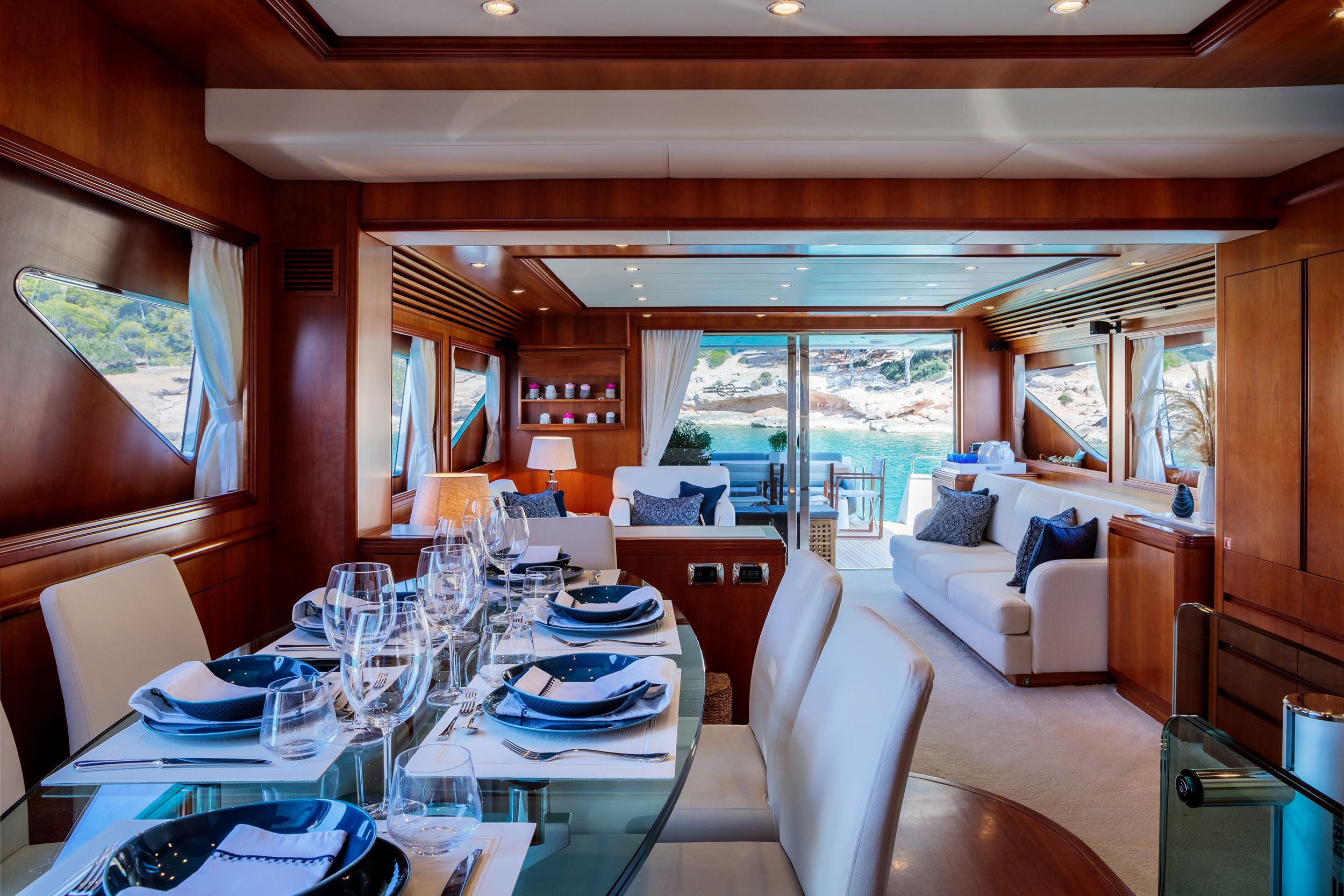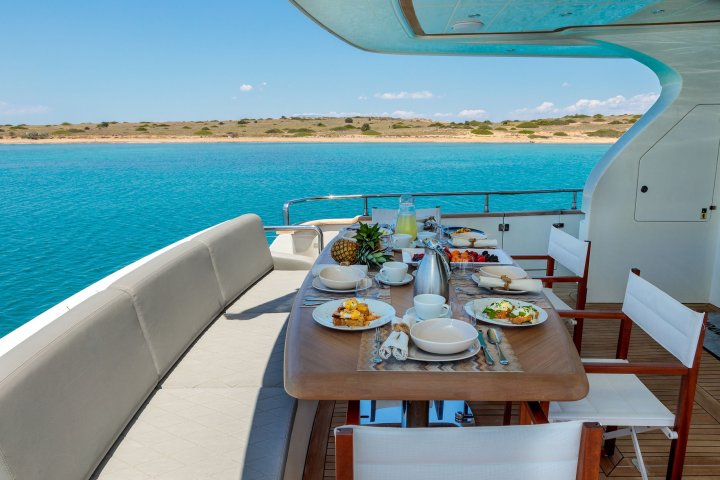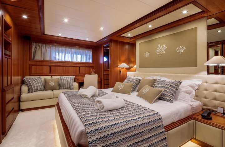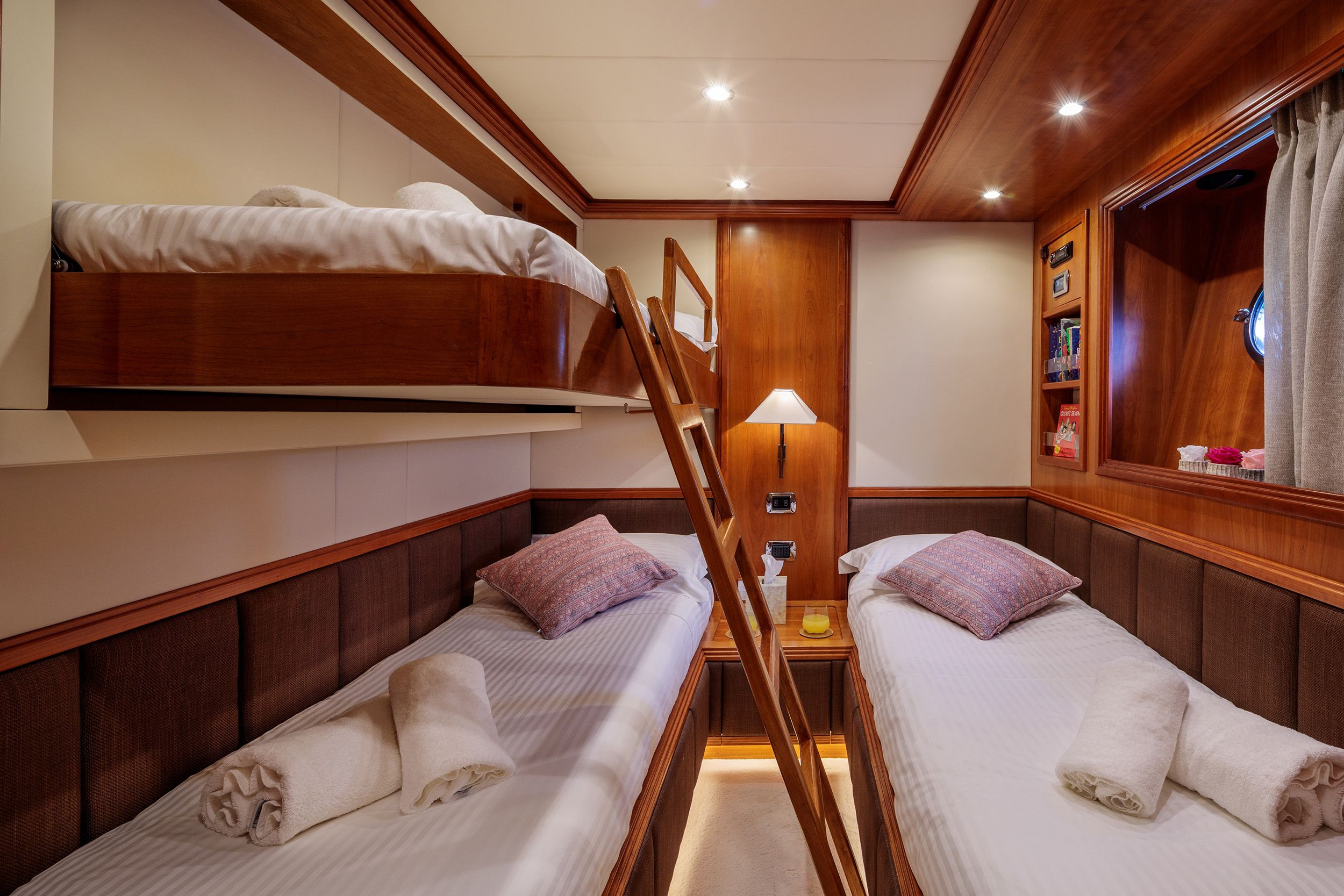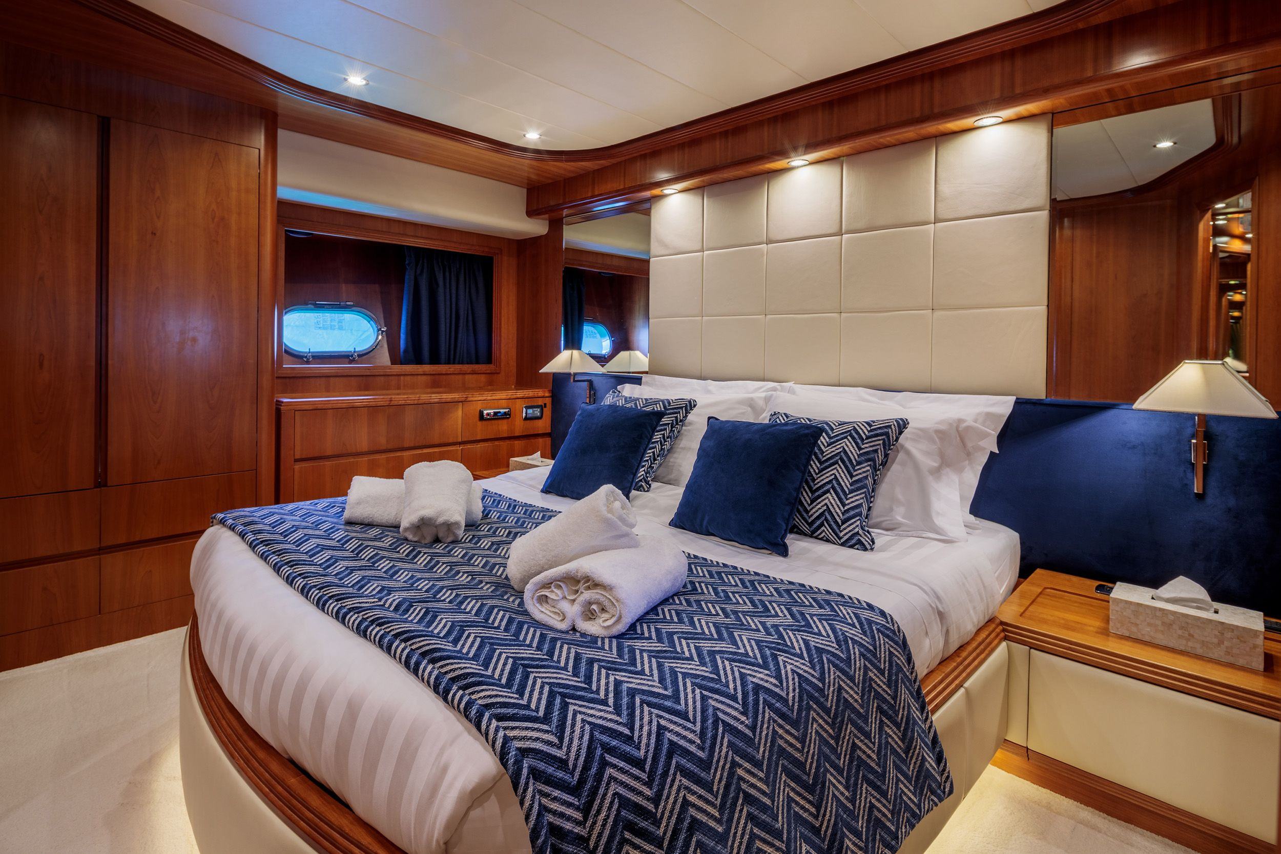 The yacht is a floating heaven. Inside, four spacious cabins in the lower deck comfortably accommodate 10 guests.