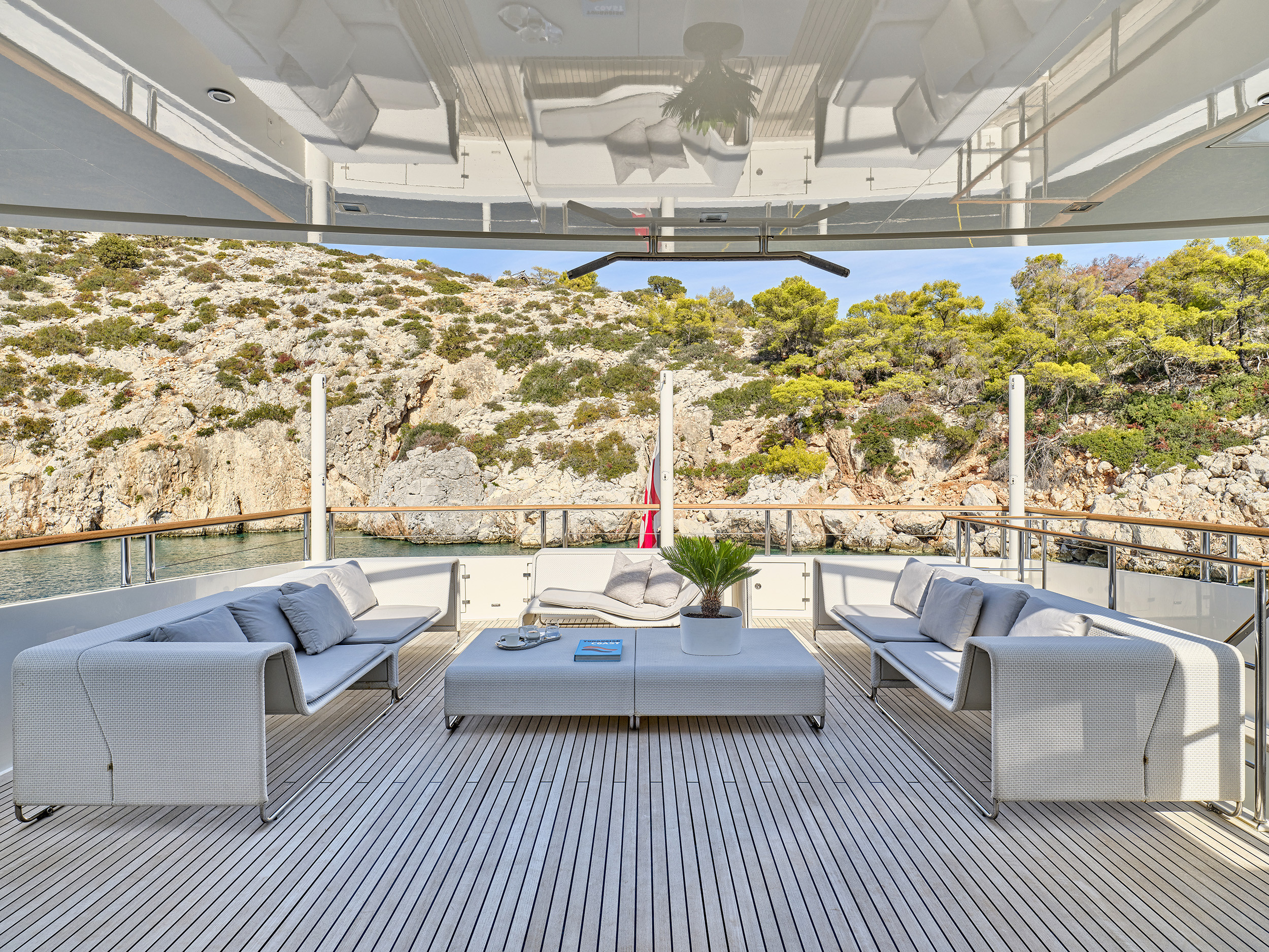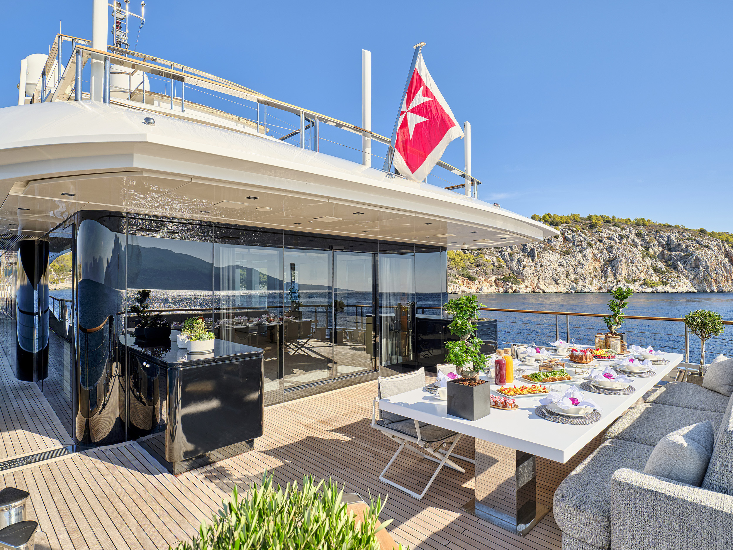Her exterior spaces are expansive and spread across three decks. The sundeck offers sunbeds, a spa jacuzzi, a dining table, and a wet bar for alfresco dining, while the large swimming platform provides easy access to the sea for relaxation and water activities.