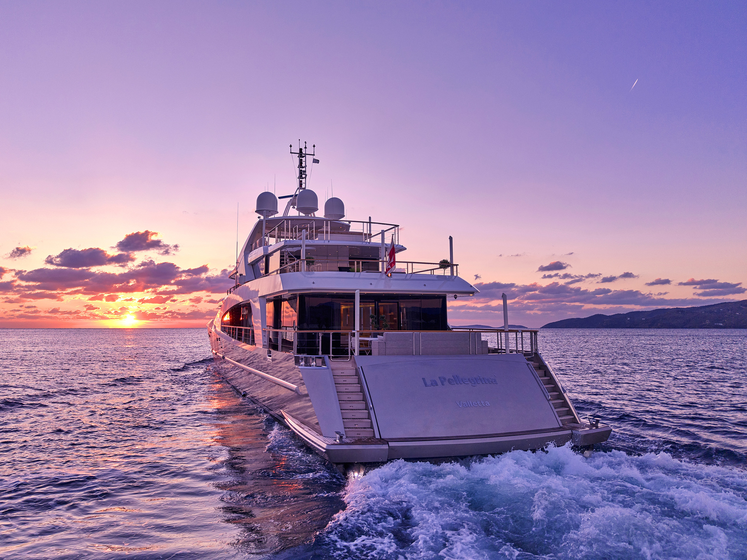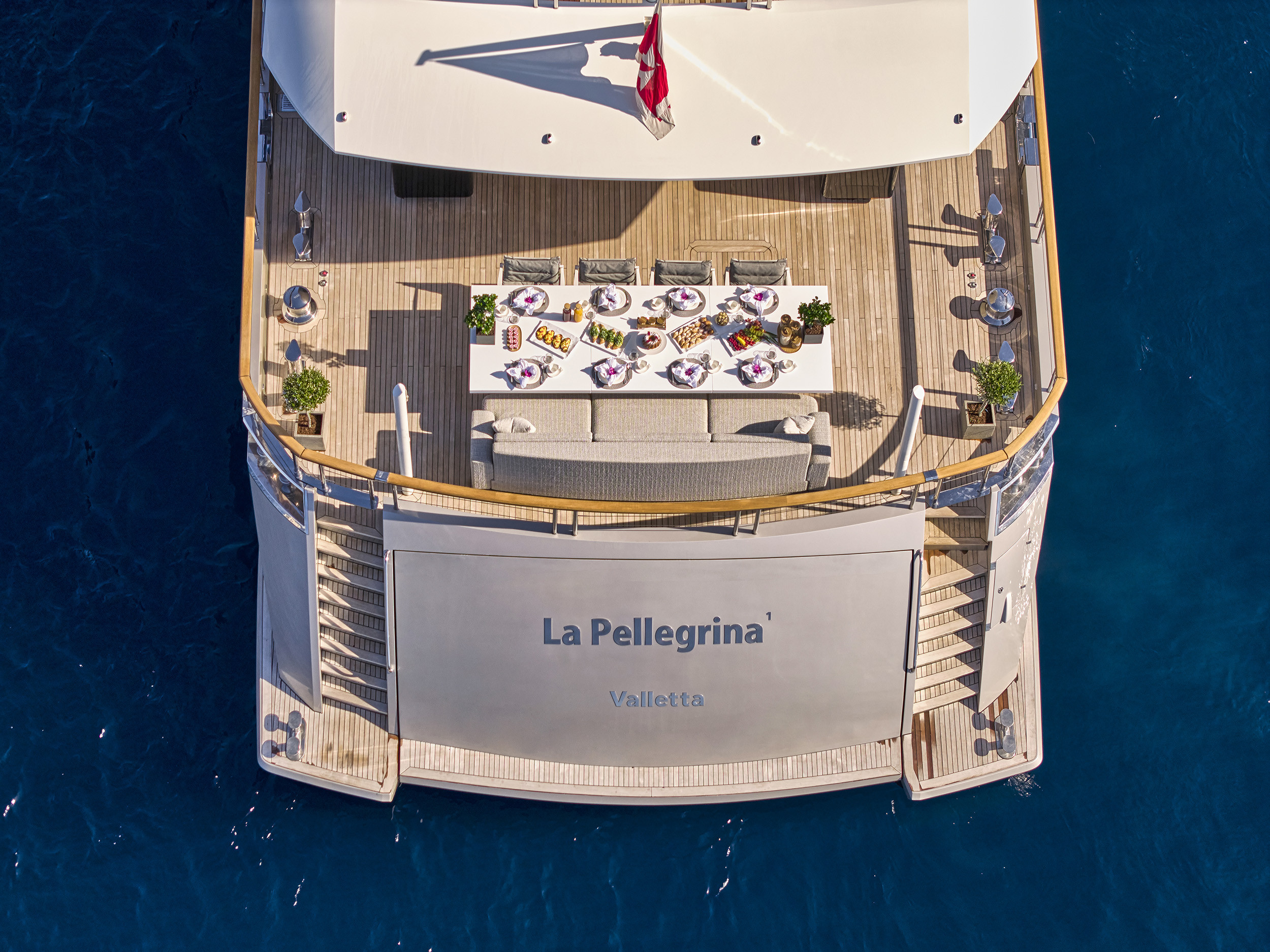 The main deck hosts a distinguished VIP suite with 180-degree panoramic views, while the full-beam Master Suite on the upper deck includes a private aft deck with U-shaped seating—perfect for relaxation or entertaining. In total, La Pellegrina 1 accommodates up to 12 guests in six luxurious cabins, including four guest suites on the lower deck (three with queen beds, one with twins).