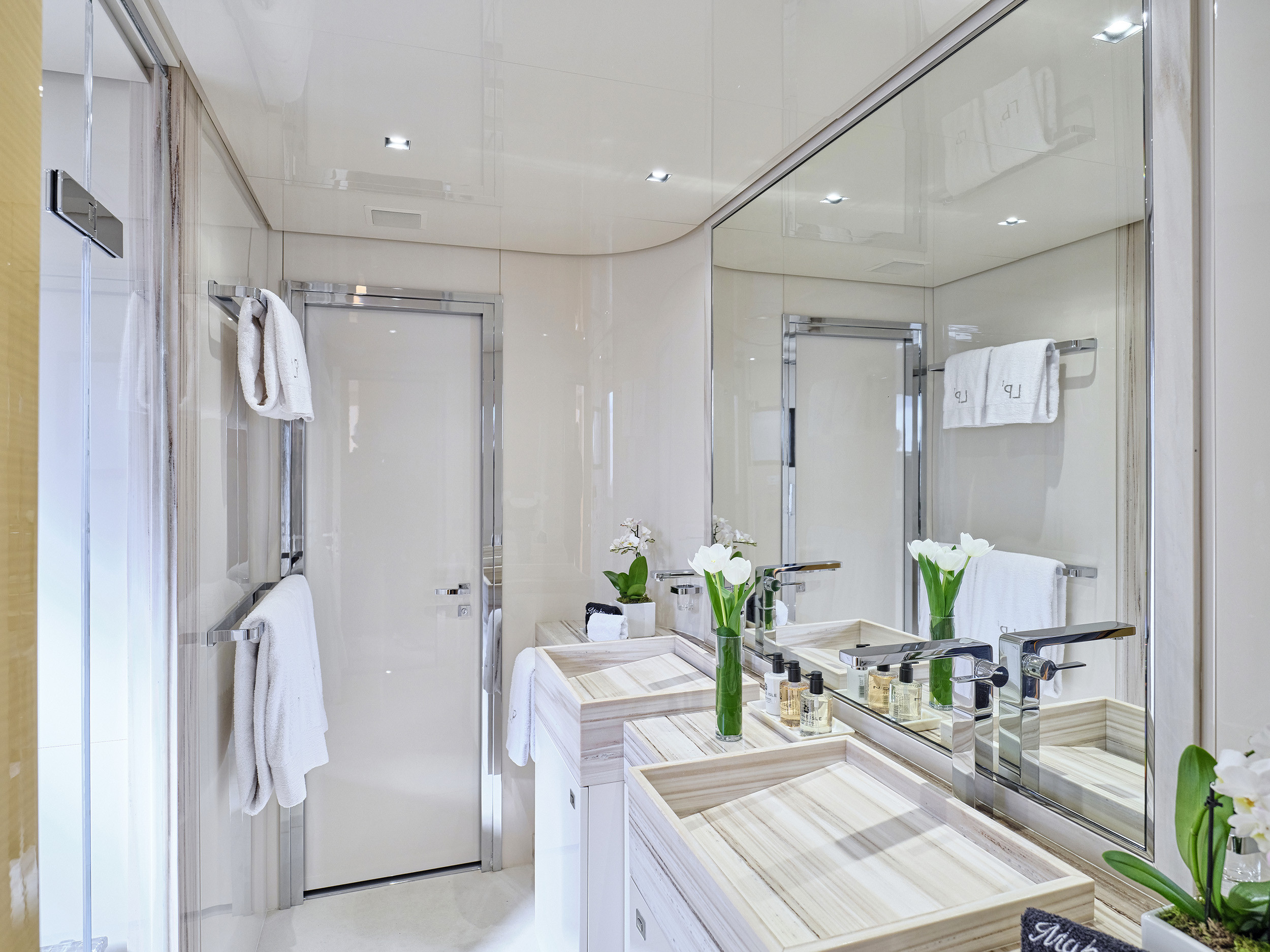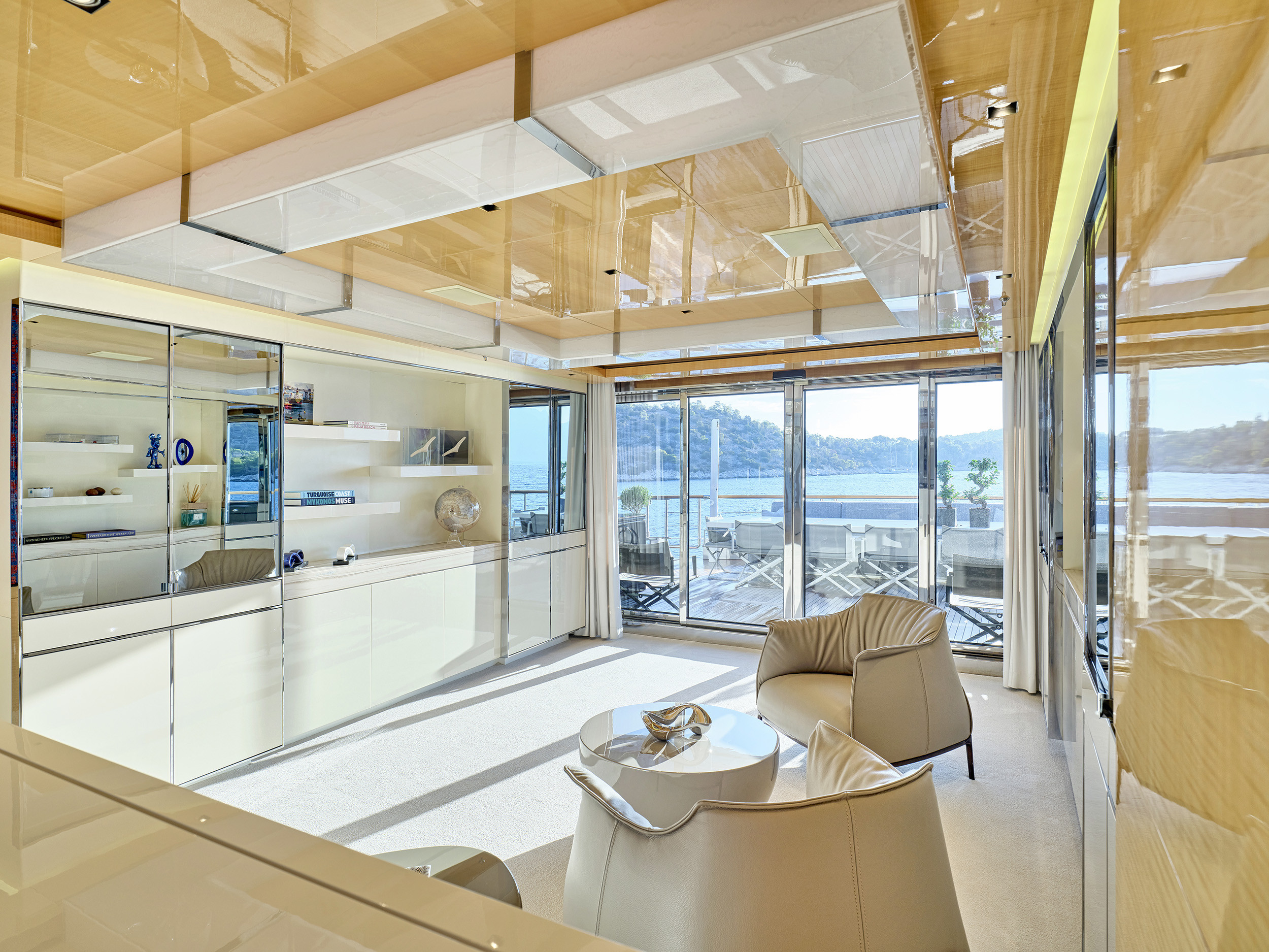 With her striking design and exceptional craftsmanship, she is a true symbol of luxury and sophistication. The open-plan main saloon, flooded with natural light from full-height windows, offers an elegant seating area and a refined dining space separated by a sleek island credenza.