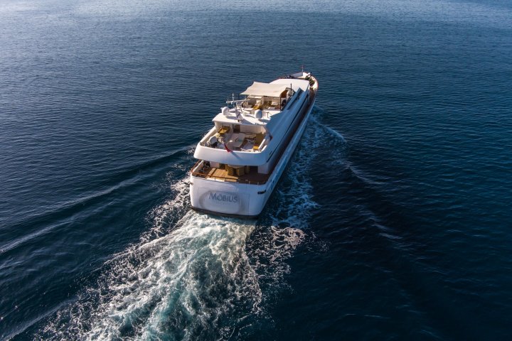 The 38m/124,8ft motor yacht Mobius built by Cantieri di Pisa offers flexible accommodation for up to 11 guests in 5 cabins and features interior styling by Agnes Comar.