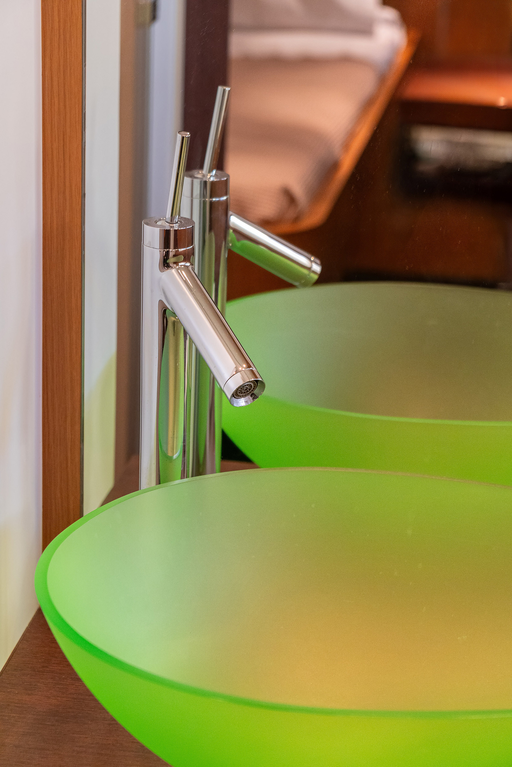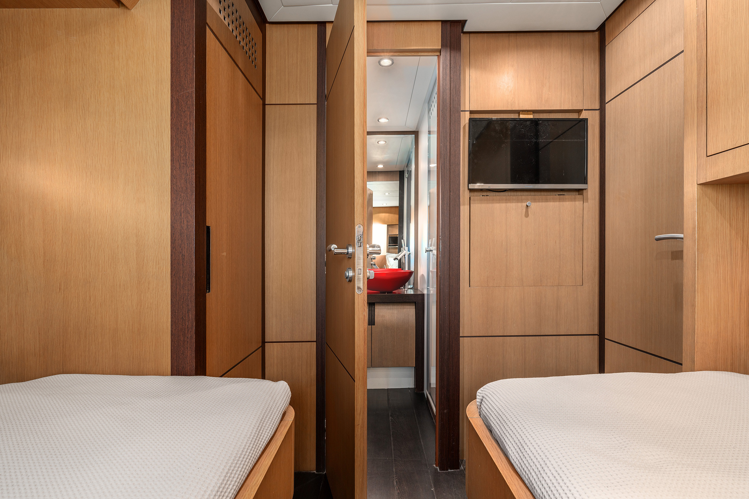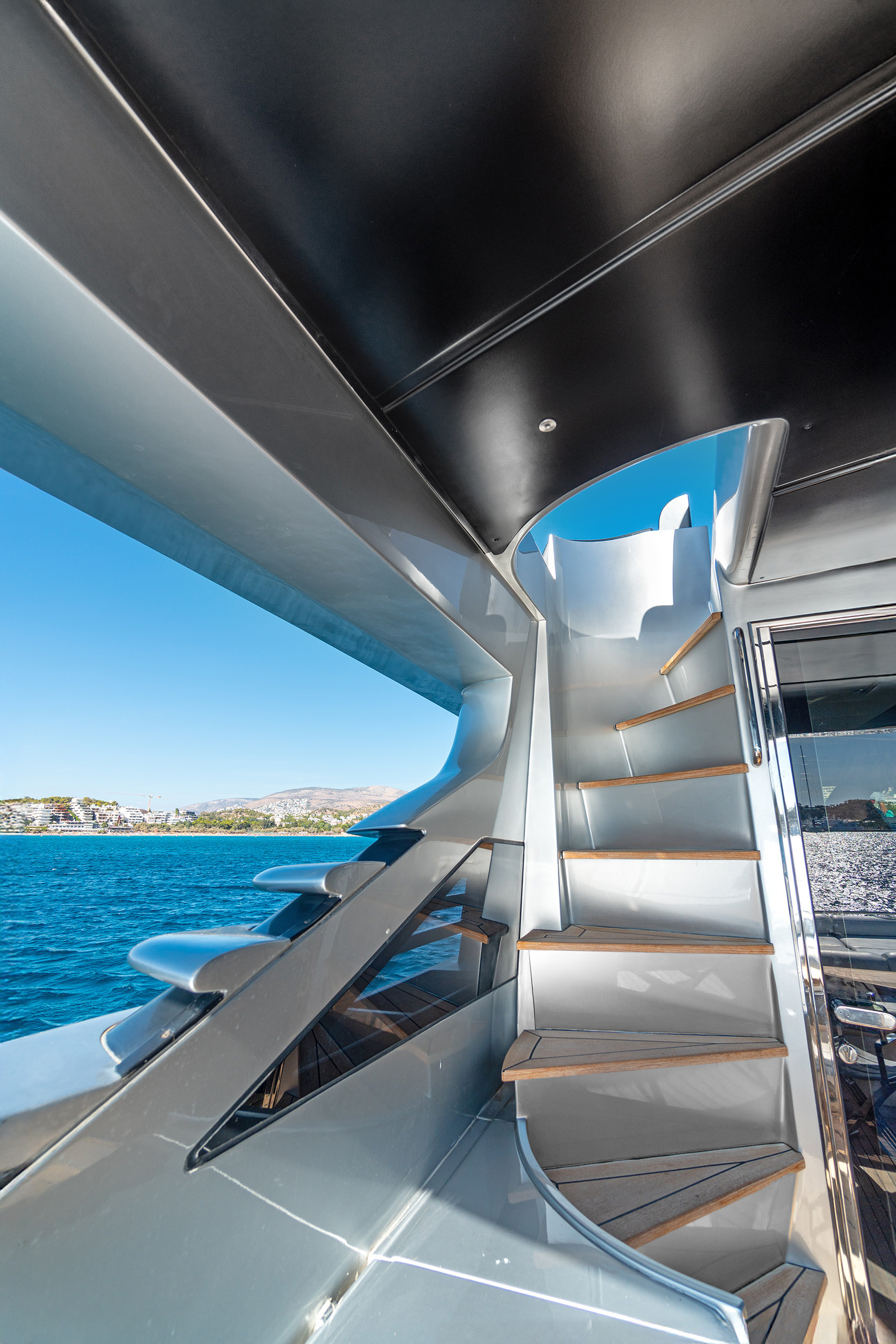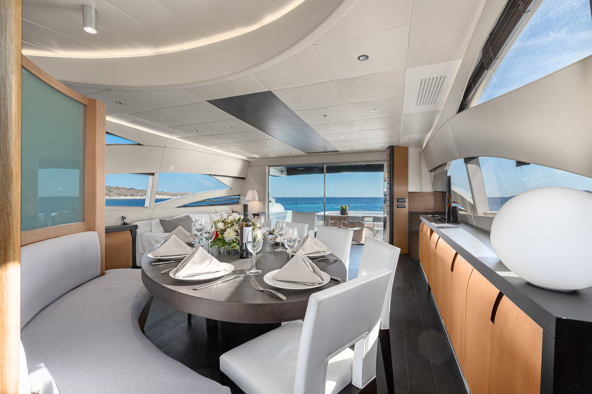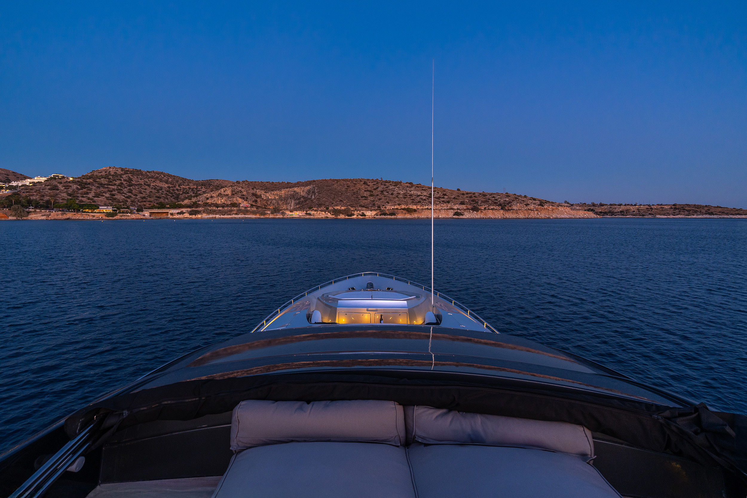 Accommodating up to10 guests, she features a layout comprising a round shaped master stateroom, a VIP stateroom and two twin cabins with extra bunk bed ideal for children. With an impressive comfortable cruising speed of 33 knots per hour and a top speed of 41 knots, she is ideal for those who want to cruise fast and expand their options for diverse itineraries