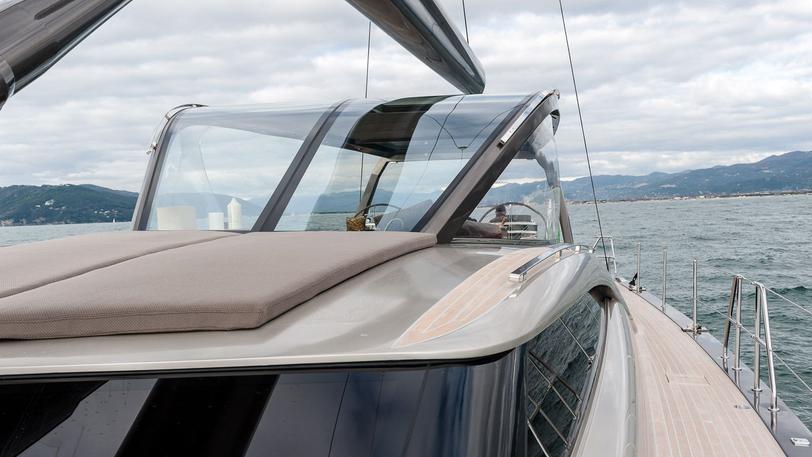 Her outdoor spaces, characterized by the large cockpit area, with two opposite facing sofa beds and two folding dining tables, create a welcoming and spacious lounge spot, sheltered by a hard-top and glass sprayhood, with a retractable roof top. Her mostly unobstructed deck, offers space atop superstructure, with sunbeds and a very cozy lounge ahead of mast, with sofa and cushions around a table, ideal for a post-swim aperitif with snacks, offering shade too. When anchored, Gigreca’s sophisticated swimming platform reveals an additional spot, right by the sea where refreshments can be served, while taking a break from watersports.
